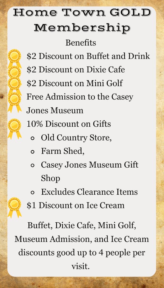 The Home Town and Home Town GOLD Memberships offers exclusive discounts on nearly every purchase in the Old Country Store and throughout Casey Jones Village!